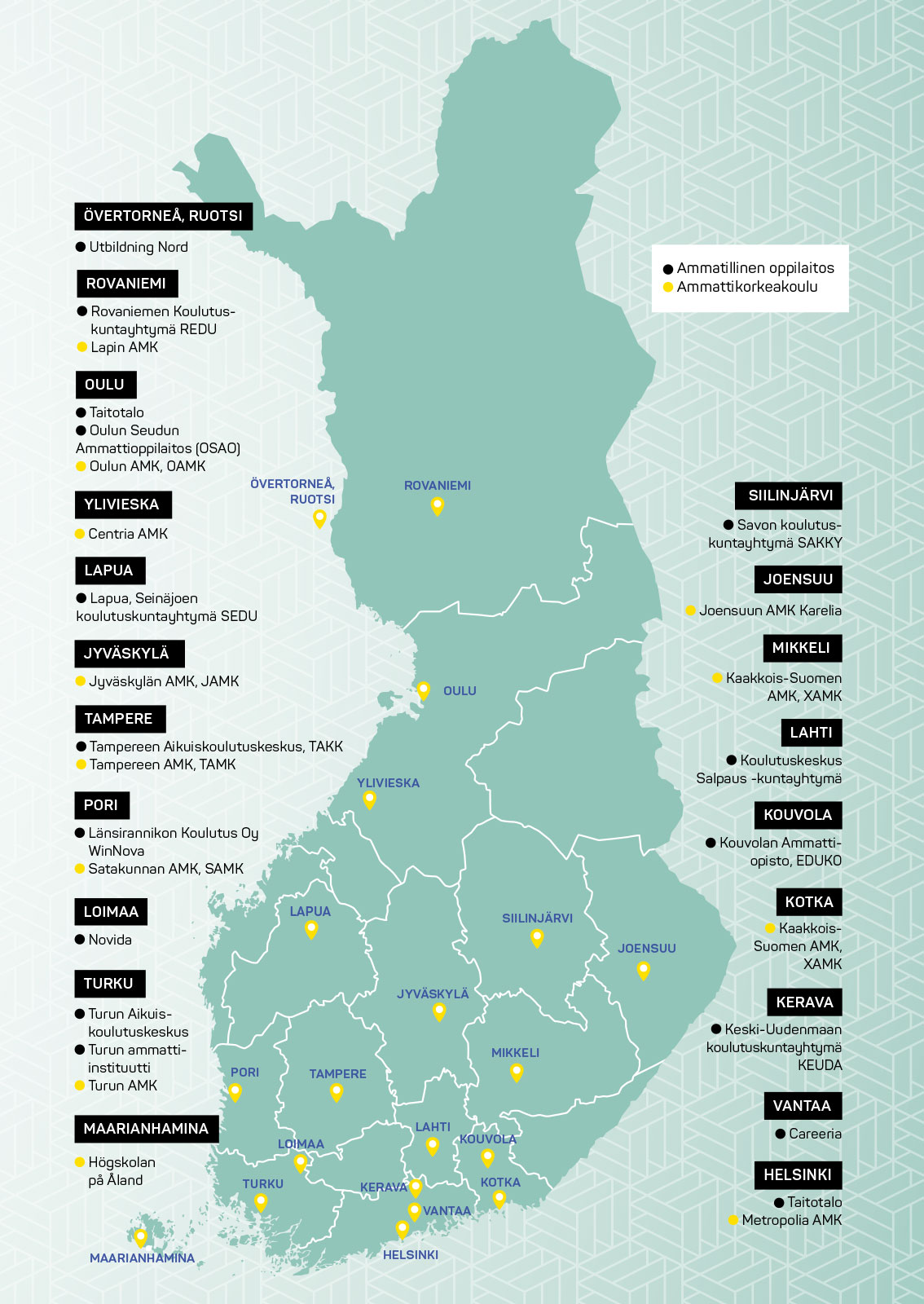 | Ammatillinen oppilaitos (tilanne 1.10.2025) | Koulutustarjontaa v. 2025–2026 | |||
